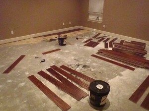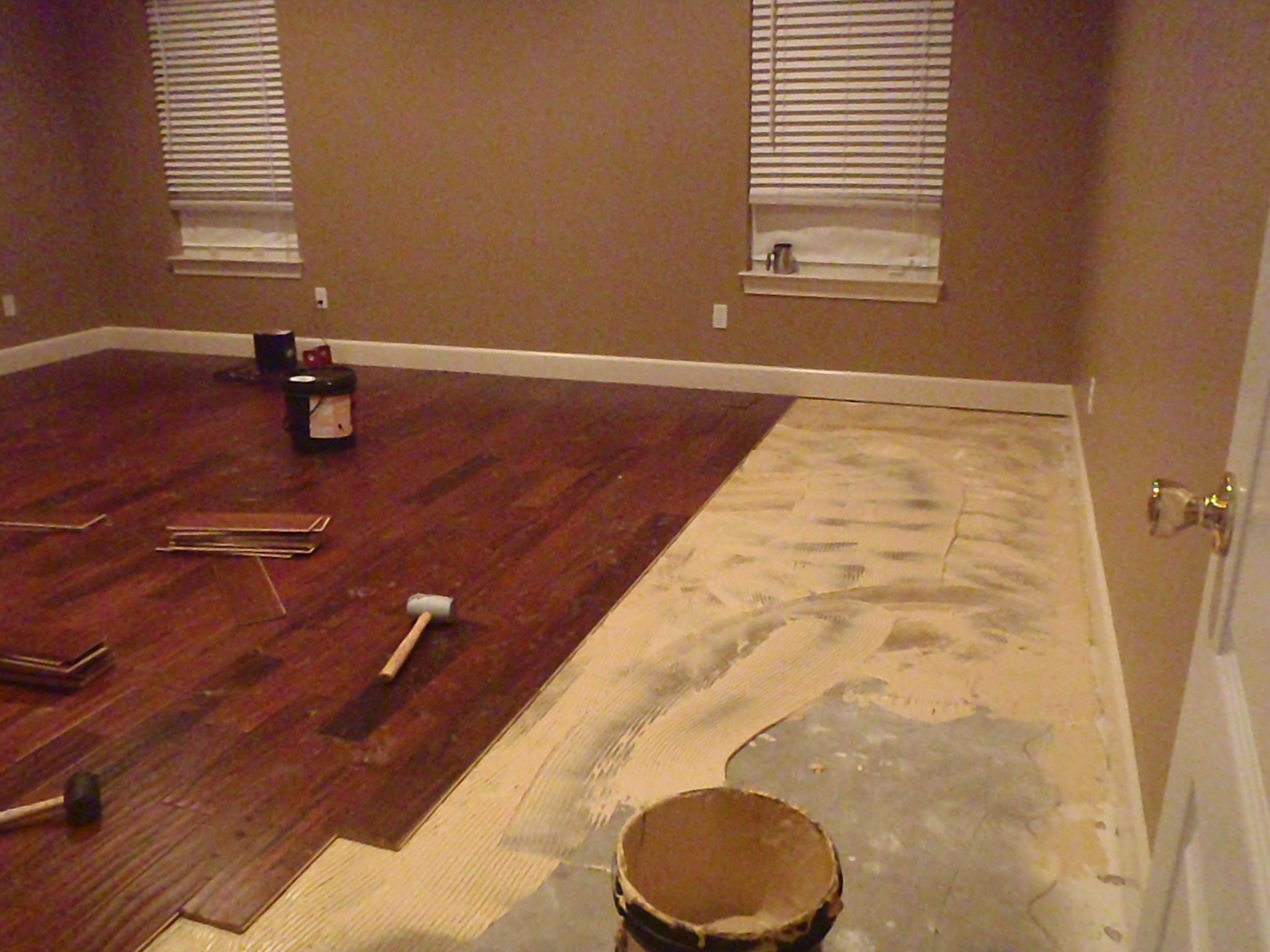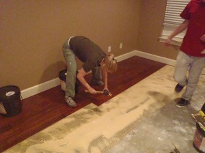 Install day was February 4th, 2012! We woke up prepared for a long, full day. I pictured myself getting drinks and snacks and helping carry in wood and deciding which piece should go where. Within about 15 minutes of getting back from the breakfast run to Chick-fil-A I was down on my hands and knees with a mallot in my hand smacking the heck out of wood planks and spreading glue and PUTTING IN WOOD FLOORS! It was really awesome – for about 8 hours. After that, I was literally on my belly, with tears rolling down my face, wondering how anyone survives labor camps! It is a bit embarrassing to admit I was so dramatic about it, but it was extremely hard work!! The icing on the cake (please be sure to recognize the sarcasm in that comment) was that once all the wood was in we looked around at the awful mess we had created with glue! We spent the next three hours (until around 3:00 in the morning) cleaning glue up off the wood floors.